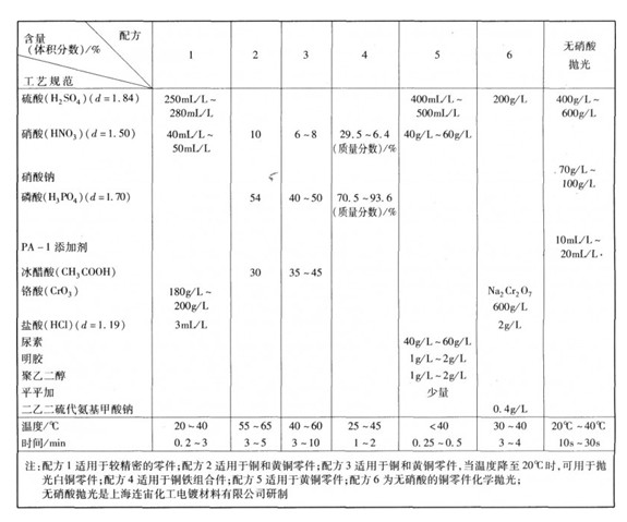 銅和單相銅合金,可以在磷酸.硝酸.醋酸或硫酸.硝酸.鉻酸型溶液中進行化學拋光。其工藝規范列于表2—4—5。